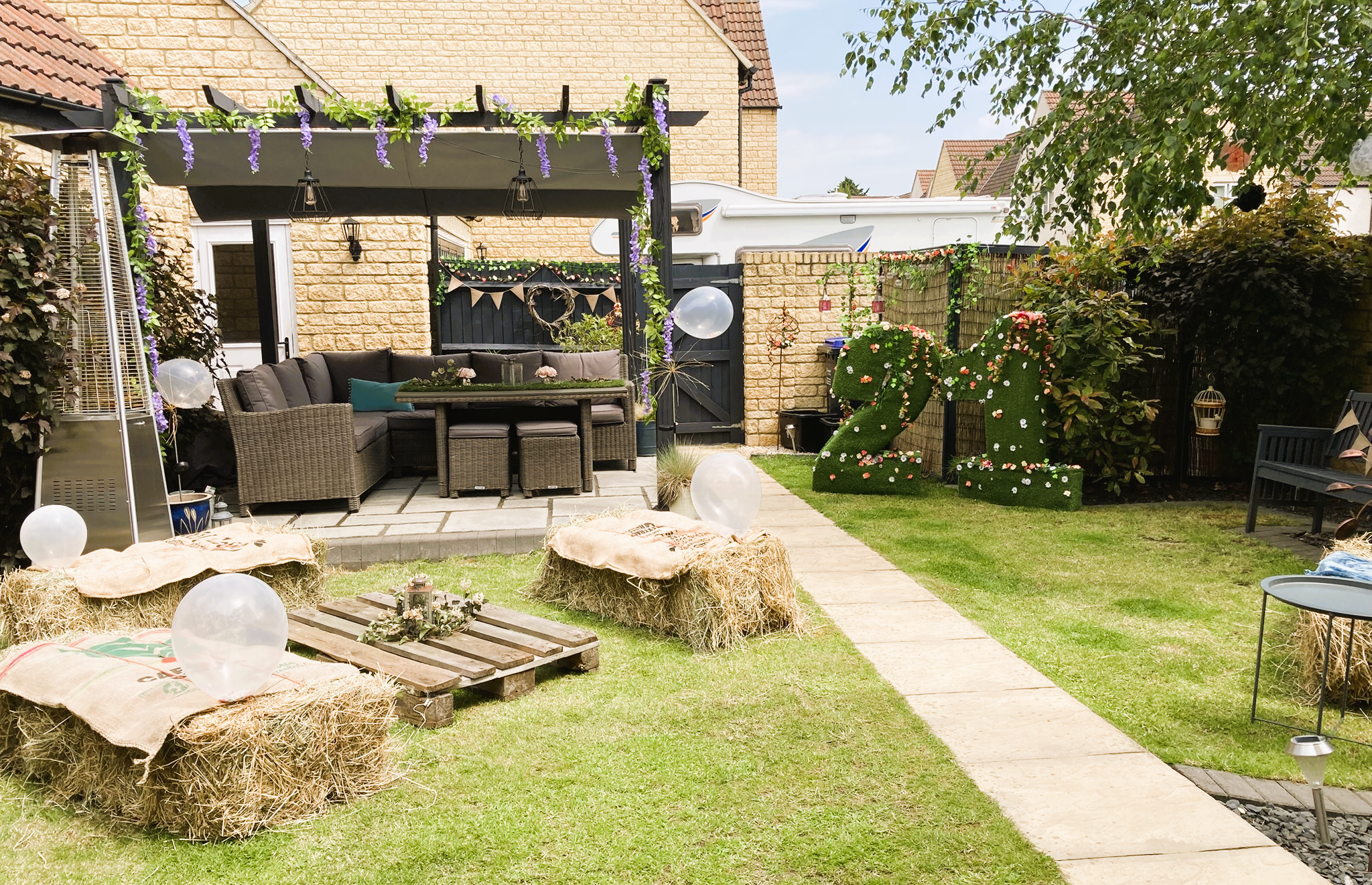 For example, for my daughter’s birthday party I bought faux wisteria, flower garlands and ivy, wrapping them around the pergola, bird feeders (I replaced the bird food with hanging lanterns, which when lit looked incredible) and fences. These then stayed up for the rest of the summer ready for any impromptu family/friend gatherings. I still have these stored in the garage, should the need arise for me to use them again.
